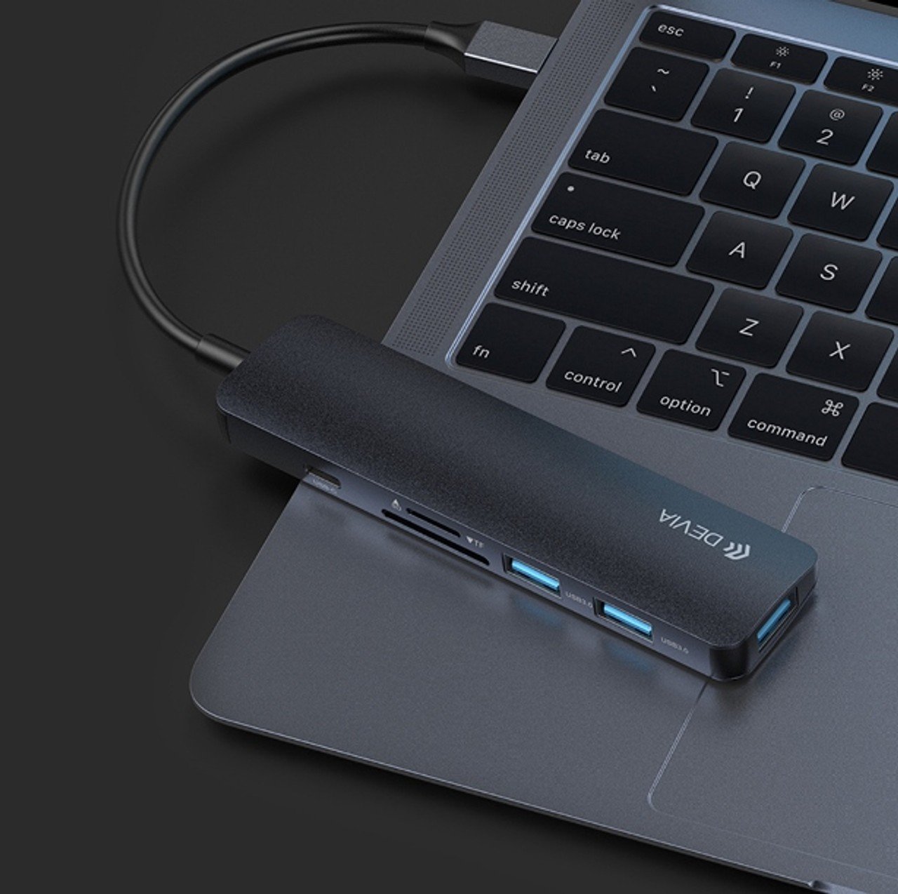 Adapteris Devia Leopard HUB 5 In 1 iš Type-C į USB 3*3 į microSD į Type-C pilkas
